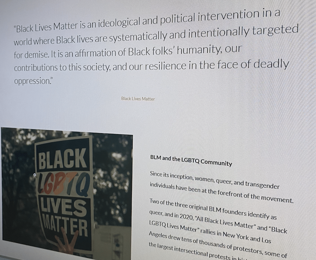 One portion of a training discusses the Black Lives Matter movement, which it describes as an “ideological and political intervention in a world where Black lives are systematically and intentionally targeted for demise.”
